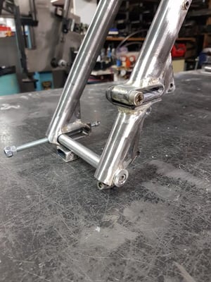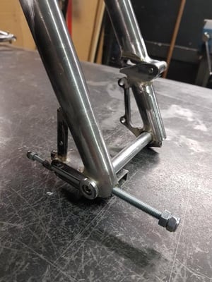 Noch waren wir nicht ganz zufrieden mit dem Handling der Prototypen und wollten ein noch besseres Fahrverhalten und neutraleres Lenkverhalten erzielen. Um das zu erreichen, baute Chrigu Hadorn eine sehr spezielle Gabel für weitere Tests, bei der der Vorlauf durch Verschieben der Achse variiert werden kann.